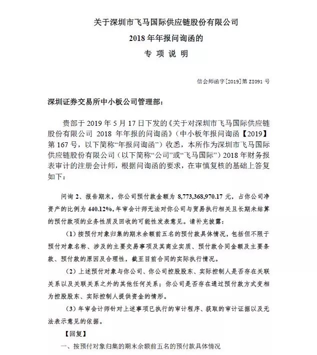 根据《关于对深圳市飞马国际供应链股份有限公司2018 年年报的问询函》(中小板年报问询函【2019】第167 号,主要问询问题有: