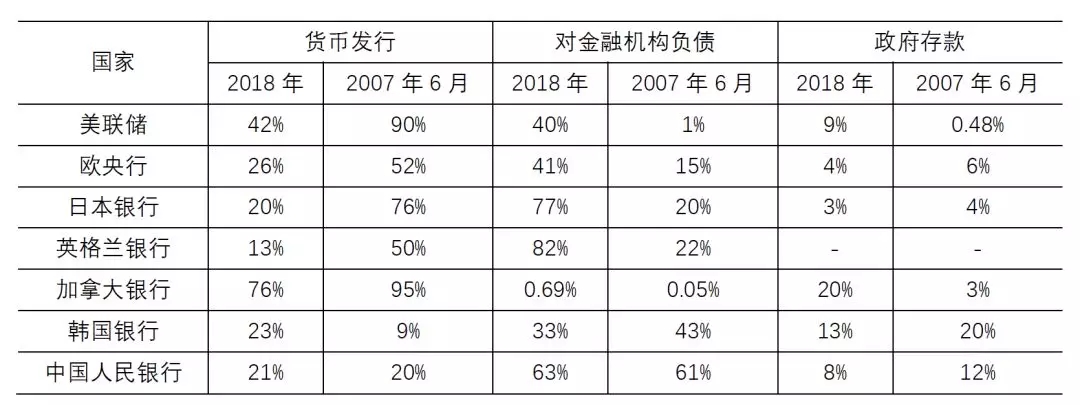中央银行负债主要由货币发行、对金融机构负债、政府存款等组成。经过大幅度扩表的央行负债结构变化为:货币发行占比明显降低,对金融机构负债占比显著上升。从2007年6月末到2018年末,美联储货币发行占比从90%下降到42%,对金融机构负债占比从1%上升到40%;欧央行货币发行占比从52%下降到26%,对金融机构负债占比从15%上升到41%;日本银行货币发行占比从76%下降到20%,对金融机构负债占比从20%上升到77%。