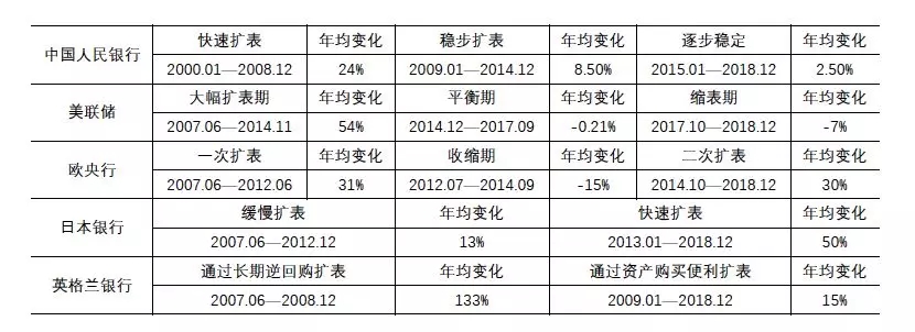 次贷危机以来,各国央行资产负债表规模普遍扩张,但扩张的幅度差异较大。具体表现为:欧美日发达国家央行资产扩张幅度更为明显,从2007年6月末到2018年末,英格兰银行、日本银行、美联储和欧央行分别扩张了6.41、4.52、3.59和2.86倍;相对而言,中国人民银行、加拿大银行、韩国银行和澳大利亚央行资产扩张程度较低,从2007年6月末到2018年末分别扩张了1.52、1.35、0.6和0.34倍。
