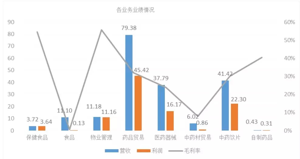 公司营收和利润均比较靠前的三大业务为药品贸易、中药饮片、医疗器械,其2018年营业收入分别为79.38亿、41.42亿、37.79亿元。