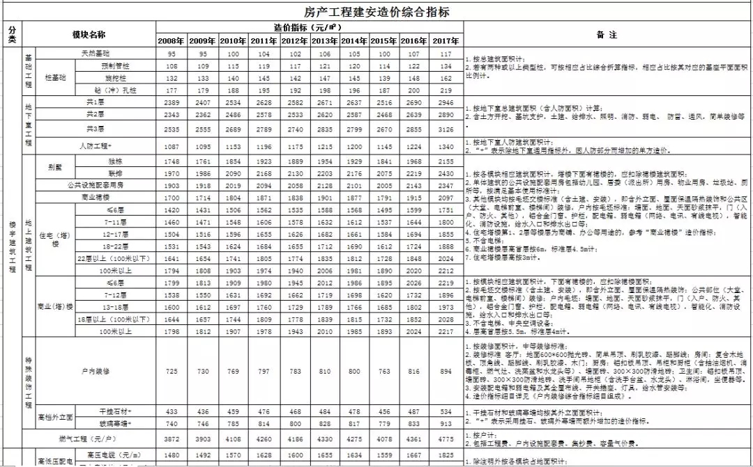 公告标准主要包含基础工程、地下室工程、地上建筑工程、特殊装饰工程、燃气工程、室外配套工程、其他工程等7个类别,用于土地增值税扣除项目中的前期工程费、建筑安装工程费、基础设施费、公共配套设施费等房地产开发成本审核。
