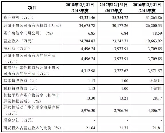 2016年至2018年,安集微电子营收分别为1.96亿元、2.32亿元、2.48亿元;净利润分别为3,709.85万元、3,973.91万元、4,496.24万元;2018年研发投入占营业收入的比例为21.64%。