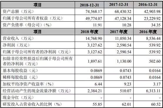微芯生物在2016年至2018年的营业收入分别为0.85亿元、1.10亿元、1.47亿元,归属于母公司所有者的净利润分别为539.92万元、2590.54万元、3127.62万元,2018年研发投入占比55.85%。