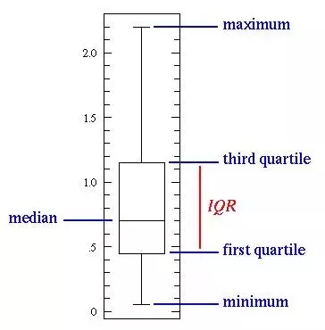 上图中,中间的直线表示数据的中位数。中位数用在平均值上,因为它对异常值更具有鲁棒性。第一个四分位数本质上是第二十五百分位数,即数据中的25%要低于该值。第三个四分位数是第七十五百分位数,即数据中的75%要低于该值。而最大值和最小值表示该数据范围的上下两端。
