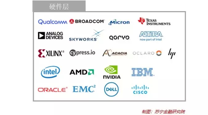 网络和数据方面,具有影响力的美国企业有英特尔(Intel)、AMD、英伟达(Nvidia)、IBM、甲骨文(Oracle)、戴尔(Dell)、EMC(隶属Dell)、思科(Cisco)、惠普(HP),涉及网络交换机、路由器、中央处理器芯片(CPU)、显示处理器(GPU)、IT服务器、数据库存储等领域。