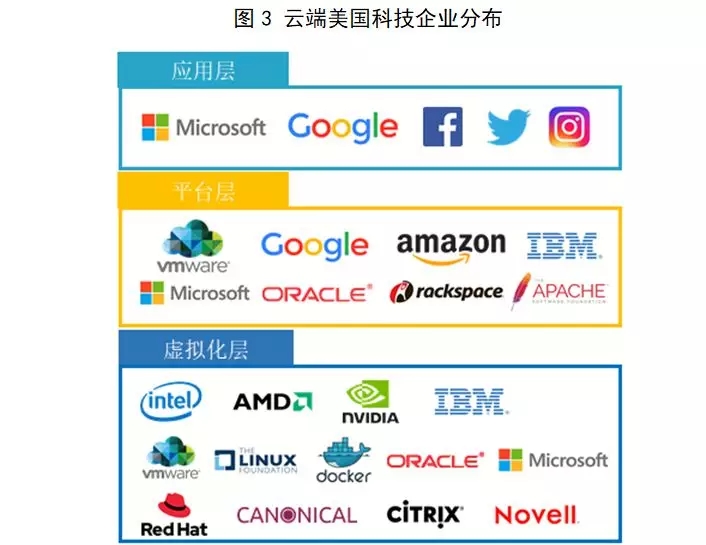 在虚拟化层,美国科技企业在全球具有垄断性技术优势,这些企业在技术版图上呈现阶梯型分布:首先,Intel、AMD、Nvidia和IBM作为芯片制造商,提供芯片架构与处理器指令集的虚拟化技术;其次,威睿(VMware)、微软、Linux基金会(美国非盈利组织掌握Linux内核开发)提供操作系统内核虚拟化技术;在被业内称为轻量级虚拟化技术的容器技术领域,也有Docker这样的美国企业占据市场主导地位;最后,还有甲骨文、红帽(Red Hat,隶属IBM旗下)、Canonical、思杰(Citrix)、网威(Novell)提供企业级虚拟化产品。