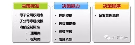 决策标准主要包括:母子公司权限表、子公司章程模板和内部控制标准。母子公司权限表是母子公司之间重大事项权限的划分。这个划分是基于控股公司的管控模式、子公司的行业特点和发展阶段、子公司所在地法律法规要求等因素综合考虑的。子公司章程模板的制定依据之一就是母子公司权限表,通过将权限表内化于子公司章程模板中,确保对子公司重要事项决策权限的清晰、无遗漏和无矛盾冲突。子公司章程模板是未来母公司制定或修订新设(收购)子公司公司章程的重要依据,集团公司可以根据区域或行业等不同属性制定不同类别的子公司章程模板。内部控制标准包括通用部分和板块适用两部分内容。其内容是对相关业务内部控制体系规定的最低标准,子公司在制定自己的内部控制体系时可以高于母公司规定的要求。内部控制标准是外派子公司的“董监高”人员(董事、监事、高级管理人员)审核子公司内部控制体系的重要依据,也是自上而下、以风险导向建立全集团内部控制体系的重要保障措施。在板块适用内部控制标准制定的过程中,母公司可以借助子公司的丰富行业经验,确保相关内部控制标准的适用性、合理性和科学性;子公司在实际运用中,也可以通过重大事项议案的形式,提请母公司修改内部控制标准或申请适用豁免。