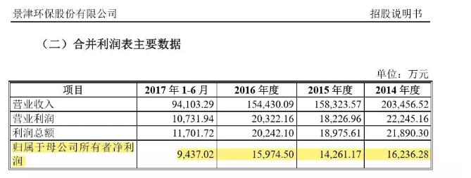 2014-2016年及2017年1-6月份,景津环保实现营业收入20.35亿元、15.83亿元、15.44亿元和9.41亿元,同期净利润分别为1.62亿元、1.43亿元、1.6亿元和0.94亿元。值得一提的是,截至2017年6月30日,景津环保账上货币资金约2.33亿元,其中银行存款达1.83亿元。
