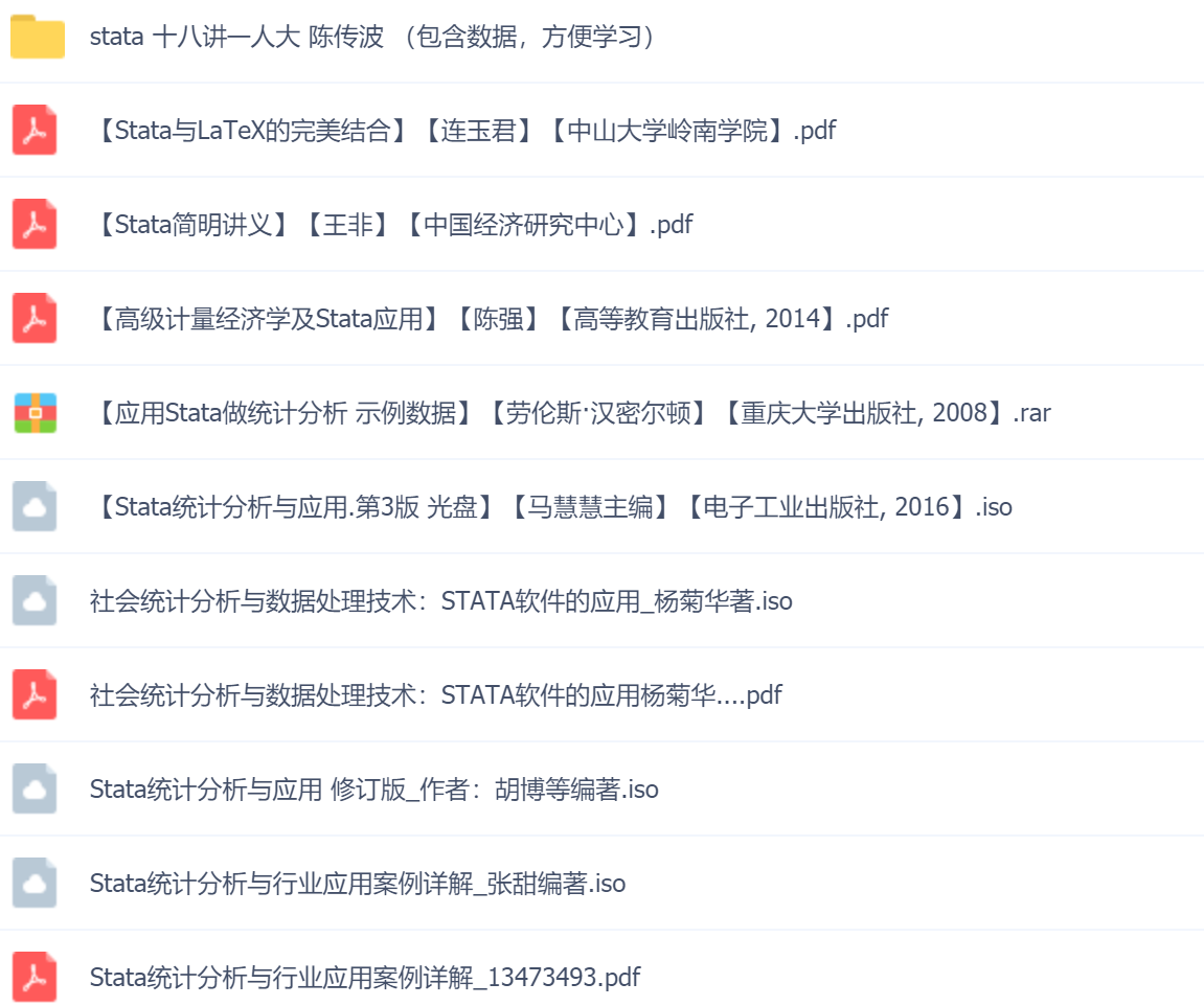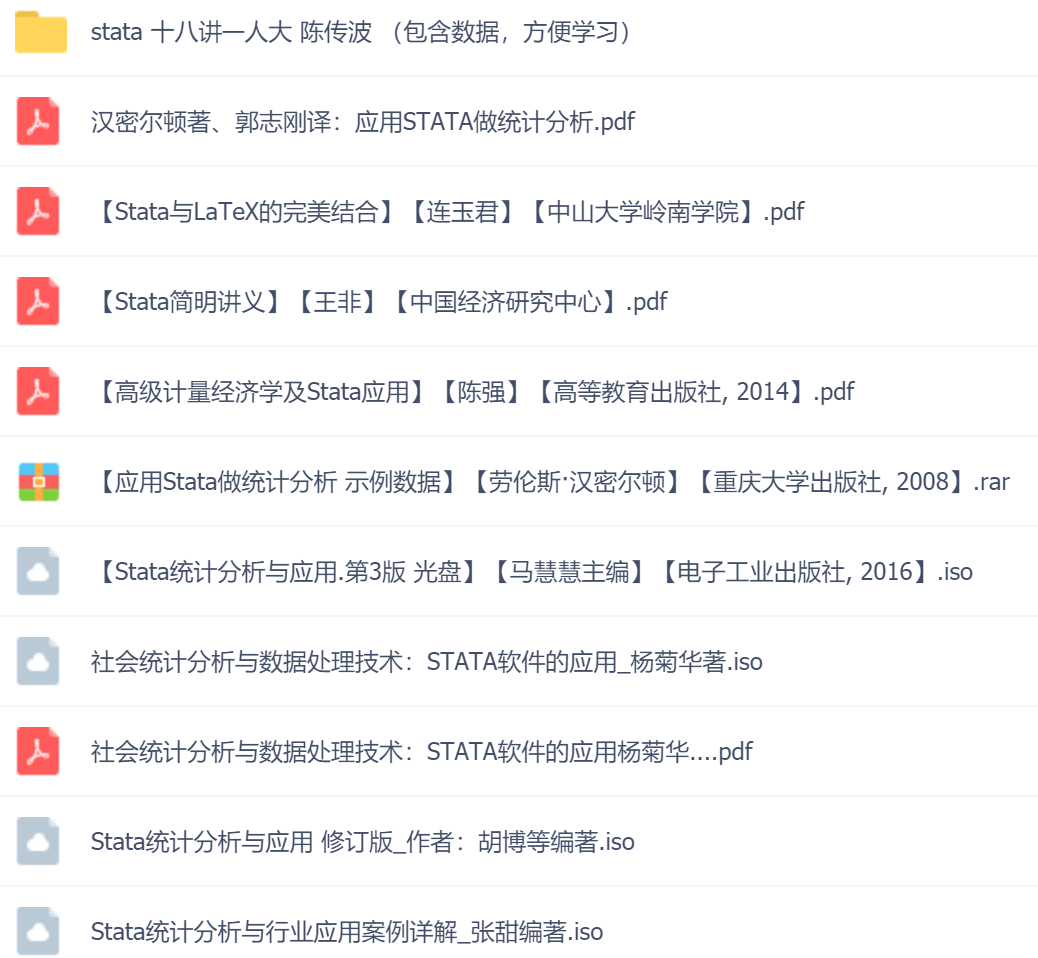 资料包含:【Stata统计分析与应用】【张鹏伟,李嫣怡著】【电子工业出版社, 2011】【Stata统计分析与行业应用案例详解】 【张甜编著】 【清华大学出版社, 2014】内含Stata教学视频&示例数据