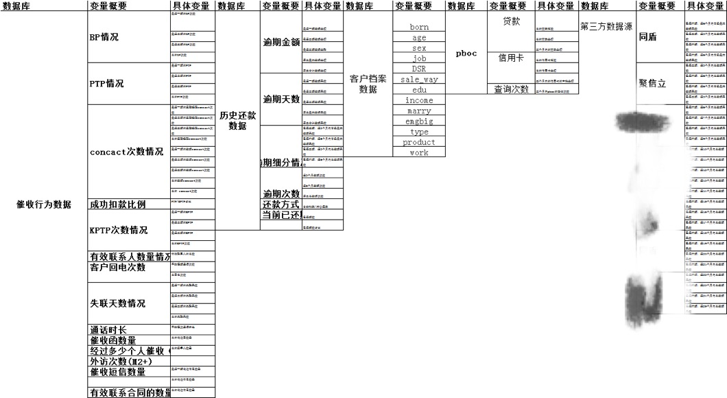 催收评分的变量整理是过程,是在业务定义后的第二个非常重要需要完成的部分,这个过程你大概是需要理清楚自己家究竟有什么数据,也就是需要知道自家的数据有哪些库存,前期先整理出一版合适的数据汇总结果: