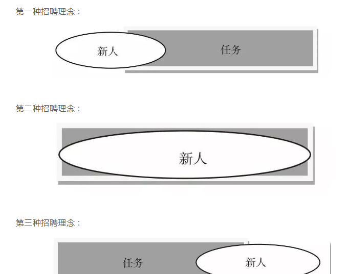 相信你的判断,企业大多会选择第一种理念,因为这是最经济省钱的。企业会选择那些尚不能完全胜任任务的新人,帮助他,让他逐渐成为第三种类型的人才。但是就企业的发展而言,其代价也是巨大的,这是以牺牲企业的快速发展为代价的廉价人力成本策略。上面三种招聘理念没有对与错,根据行业不同,都可以成为最合适的理念。