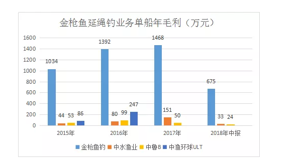3.13金枪鱼延绳钓单船毛利高与同行十倍以上以各家企业延绳钓金枪鱼业务的单船毛利来看,金枪鱼钓也是高的吓人。2015年-2018年上半年,金枪鱼钓单船毛利为1034/1392/1468/675万元,高于同行十倍以上。