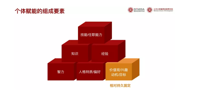 由此看,“个体赋能”组成要素中,很重要一条就是看“这个变化的时代中,究竟是什么在影响我们每个人的行为举止”。是技能?是知识?是经验?以上因素尽管都会对个体产生巨大影响,但却不是推动一个人向前走的动力。真正推动一个人往前走的动力来自以下三项: