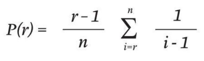 你停止找寻并和最佳人选安定下来的概率(用P代表),与潜在恋人(n)中被你拒绝的人数(r)是相关联的,公式如下:
