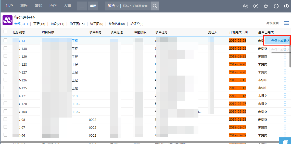 相关人员可直接在任务列表中直接点击任务完成确认进行反馈;项目任务列表能够实时反映出哪些任务已经提交,哪些任务在审核中,防止出错。