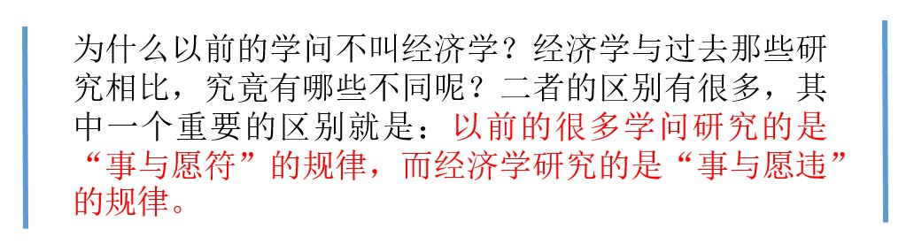 二者的区别有很多,其中一个重要的区别就是:以前的很多学问研究的是“事与愿符”的规律,而经济学研究的是“事与愿违”的规律。