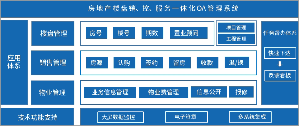 为了实现销售全程电子化办理,OA将销售中的一个个场景细化,通过和ERP系统、电子签章系统集成,构建集申报、签约、审批于一体的标准化售楼系统。