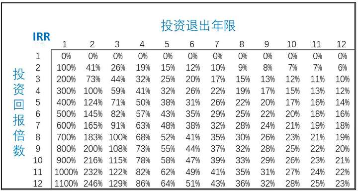 根据上面的关系,我们其实也可以做一个双因素敏感性分析表,来看一下,不同的投资回报倍数和投资退出年份,对应的内部收益率分别是多少?