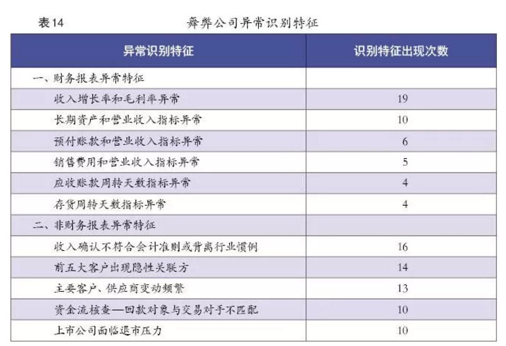 五、结论与启示本文的分析表明,发生在制造业和农林牧渔业的上市公司财务舞弊案件较多;经济欠发达地区的财务舞弊高于经济发达地区;经营规模越小的上市公司更容易发生财务舞弊;财务舞弊被发现的“滞后周期”约为3~5年;外部审计在发现财务舞弊方面的作用十分有限;利用关联方和虚构交易操纵收入是上市公司最常用的舞弊手法;虚构货币资金收支掩盖财务舞弊痕迹的做法日趋普遍;收入和毛利率异常是最有效的财务识别特征,滥用收入确认会计政策与前五大客户出现隐性关联方是最有效的非财务识别特征,财务与非财务识别特征之间并不是相互独立的关系,往往以组合形式出现在同一家财务舞弊上市公司中。