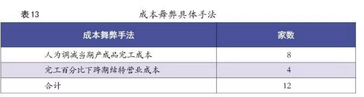 如表13所示,成本舞弊手法较为单一,但具有一定的行业依赖性。例如农业类上市公司,其存货投入产出率较难验证,人为调减当期产成品成本的概率较高。又如设备制造业、信息技术服务业等采用完工百分比法的上市公司,由于高度依赖于对完工进度的估计,发生成本舞弊的概率亦较高。
