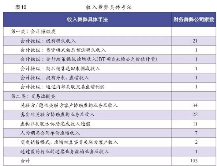 笔者将收入舞弊区分为会计操纵和交易造假两种类型。会计操纵类主要表现为上市公司管理层通过选择对自身更有利的会计判断,以达到操纵业绩的目标,最常见的就是提前确认收入。交易造假类主要表现为上市公司管理层虚构交易以达到虚增收入的目标,最常见的是通过关联方客户或者隐性关联方,串通合谋虚构业务和收入。如表10所示,样本公司的财务舞弊以交易造假类为甚,占比高达75%。