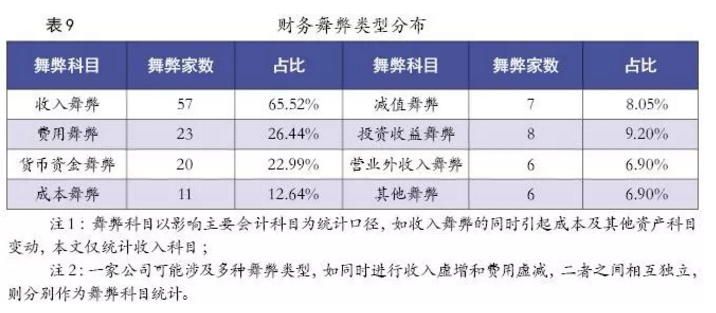 笔者还注意到存在同一家上市公司采用多种舞弊类型进行业绩操纵的趋势,87家样本公司共计涵盖138种舞弊类型,平均每家公司为1.58种。除了常规的收入、成本费用舞弊之外,货币资金、投资收益、营业外收入、减值等科目亦成为管理层操纵业绩的对象。