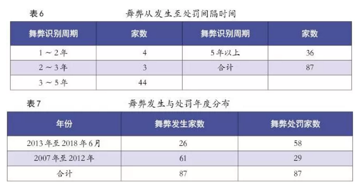 表5列示了样本公司发生舞弊的年度分布情况,除了最近几年的财务舞弊可能尚未被发现(由表6可知,一家公司从舞弊发生到被监管处罚的间隔周期一般需要3年以上)外,2013年之后,财务舞弊处罚家数占比为66.67%(表7)。