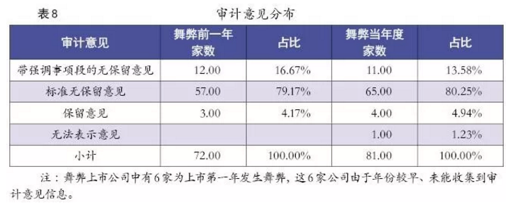 如表8所示,外部审计在识别财务舞弊方面发挥作用十分有限。审计师在上市公司实施财务舞弊的前一年,出具的大多数(79.17%)审计意见是标准无保留意见,仅有20.83%左右的非标审计意见表示了一定质疑。进一步分析表明,即使在舞弊发生当年度,审计师出具标准无保留意见审计报告的比例不降反升、由79.17%提高至80.25%,仅有1家上市公司被出具了无法表示意见的审计报告。