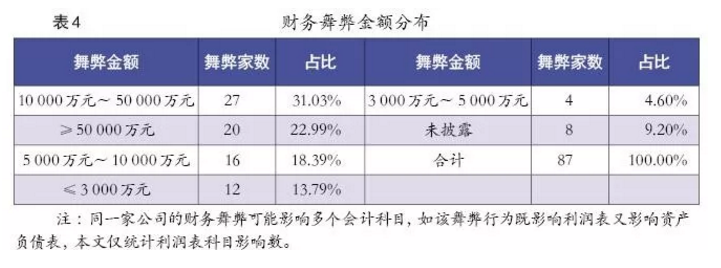 如表4所示,样本公司舞弊金额为5 000万元以上的占比为72.41%、造假金额在1亿元以上的占比为54.02%。