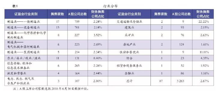 一、样本选择和分析方法本文的财务舞弊样本公司主要来源于证监会的处罚公告,具体的数据来源于WIND数据库。样本选择系从WIND数据库中导出2007年至2018年6月期间A股上市公司违规事件,并针对“违规类型”和“具体违规行为”字段进行手工处理,筛选出符合“财务舞弊”的样本上市公司78家,其中有3家上市公司存在重复舞弊的情况;本文还从证监会等公开网站中收集涉及财务舞弊行为的9家IPO公司,这9家公司因为财务舞弊最终未能成功上市。通过分析这87家上市公司的财务舞弊样本(以下简称样本公司),得以窥见财务舞弊的特征。在分析方法上,本文主要借鉴COSO《1998-2007舞弊财务报告》的分析框架,也借鉴美国注册舞弊审查师协会(ACFE)《2018年职业舞弊与贪污全球报告》的研究思路。本文是中国财务舞弊研究中心构建“五维度”(财务税务维度、行业业务维度、公司治理维度、内部控制维度和数字特征维度)财务舞弊识别模型的前期研究成果。