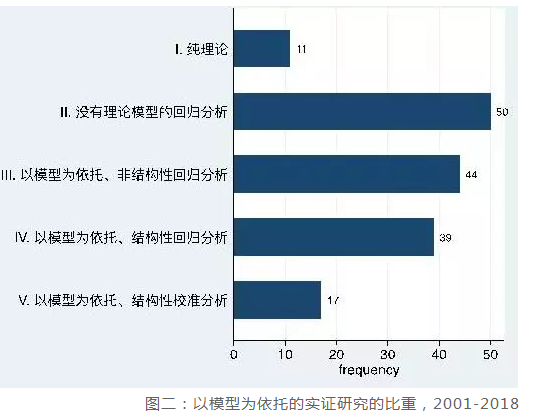 其余超过全部研究60%的论文都用到了模型。这里面又大致可以分为三类:一类只是用模型说明道理,回归分析中估计的并不是模型的参数,我们把这一类研究叫做“以模型为依托的、非结构性的回归分析”;第二类不光用模型说明道理,而且所做的回归分析的目的就是为了估计模型的参数,我们把这一类研究叫做“以模型为依托的、结构性的回归分析”;最后一类应用的模型特别复杂,以至于模型的参数之多已经很难一次全部估计出来,不得不从他人的研究中借用一些参数的估值来进行反事实的分析,我们把这一类研究叫做“以模型为依托的、结构性的校准分析”。