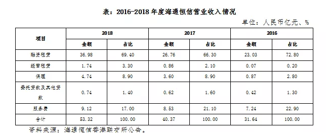 海通恒信的融资租赁业务为其收入的主要构成,融资租赁业务收