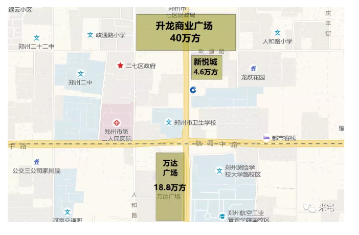 在郑州二七区的大学路航海路周边,聚集了三个综合性购物中心,升龙商业广场 、新悦城、二七万达,三者综合面积相加达到了夸张的65万平方米。但是作为一个区域性存在,这完全从不考虑市场是否有能力消化如此庞大的存在?