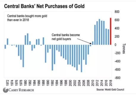 世界黄金协会(World Gold Council)报告称,在2018年,全球央行购买了651吨黄金,同比增加75%。这是自1971年以来,央行黄金最大规模购买黄金。