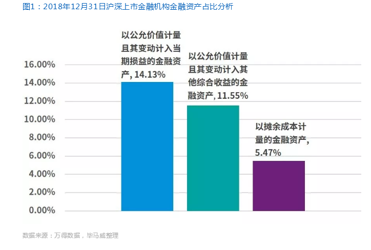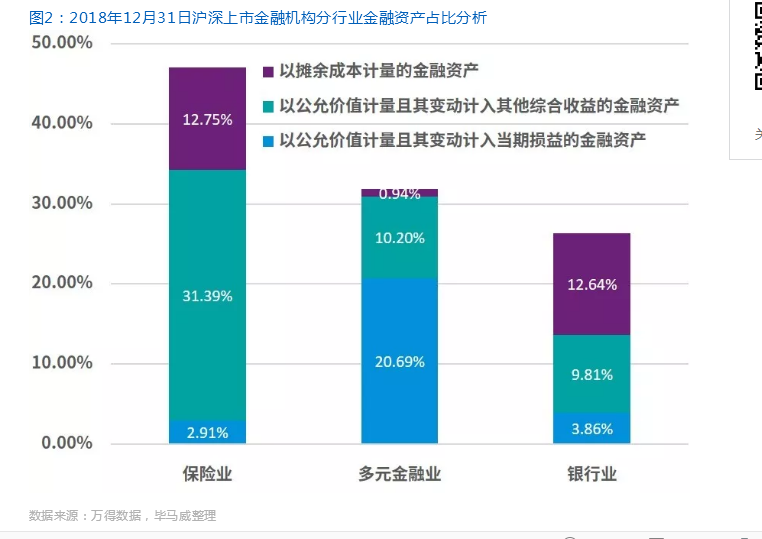 公允价值在财务报表中占有重要地位,其主要通过三种途径影响财务报表。一是影响损益,主要包括衍生金融工具、交易性债券以及股票等,其占2018年末沪深上市金融机构总资产的比重为14.13%,其中以多元金融行业占比最高,达20.69%;二是影响其他综合收益,主要包括以公允价值计量且其变动计入其他综合收益的债券、票据和股权等,其占2018年末沪深上市金融机构总资产的比重为11.55%,其中以保险行业占比最高,达31.39%;三是虽然不影响损益或权益,但需要披露公允价值信息,主要包括以摊余成本计量的债券,其占2018年末沪深上市金融机构总资产的比重为5.47%,其中以保险业和银行业占比较高,均超过12%。总体来看,以2018年末资产占比为衡量对象,公允价值对财务报表的综合影响超过30%,其中对保险业、多元金融业以及银行业财务报表的影响分别为47.05%、31.83%和26.31%。