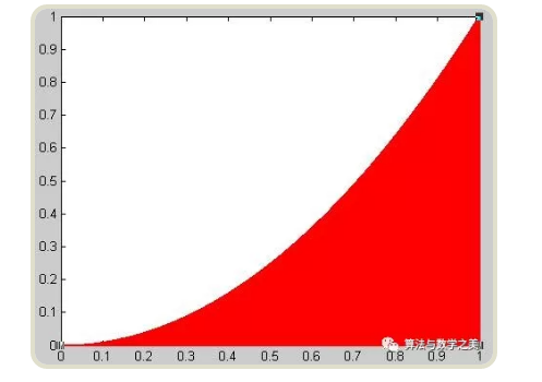 这个函数在 (1,1) 点的取值为1,所以整个红色区域在一个面积为1的正方形里面。在该正方形内部,产生大量随机点,可以计算出有多少点落在红色区域(判断条件 y < x2)。这个比重就是所要求的积分值。