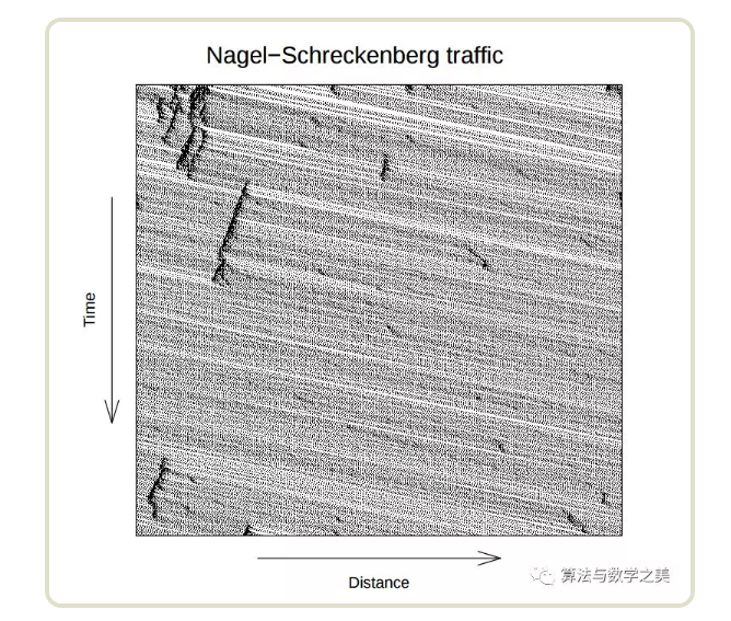 可以看到,该模型会随机产生交通拥堵(图形上黑色聚集的部分)。这就证明了,单车道即使没有任何原因,也会产生交通堵塞。