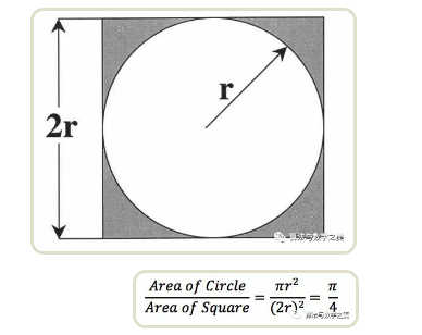 正方形内部有一个相切的圆,它们的面积之比是π/4。