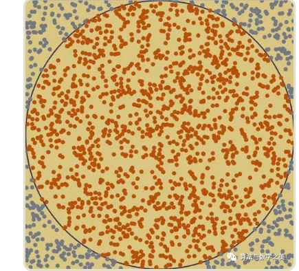 现在,在这个正方形内部,随机产生10000个点(即10000个坐标对 (x, y)),计算它们与中心点的距离,从而判断是否落在圆的内部。