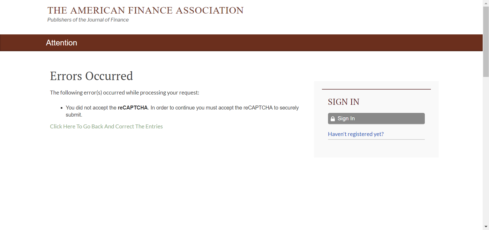 请问有一起投稿美国金融学会吗,注册AFA没法成功怎么办,如图