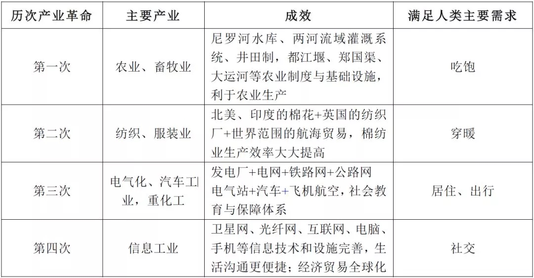 每次产业革命的发生都必须是符合人类(特指大规模人群,而非某地域、某阶层)追求更好生活的需要,前四次产业革命都是出于人类提高物质生活水平、满足精神生活的需要,农业革命、纺织业革命、电气革命、信息革命先后满足了人们吃饱—穿暖—住与行—社交等需求,并带来生产方式、生活方式的极大改变,给人类带来全新的体验和满足。