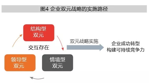 “万物负阴而抱阳,冲气以为和”,讲究的是阴阳互动,互动才能得到和谐。同样,以实现利用和探索能力培养为目标的结构型双元、情境型双元和领导型双元三者之间必然是相互流通、交互存在的。结构型双元通过建立不同的组织结构方式来处理当前企业面临的矛盾任务;情境型双元则通过情境工具为组织解决双元需求;领导型双元则是通过领导特质来帮助双元能力构建,即从从空间分离、情境设计和双元领导三个层面进行双元战略的实施。
