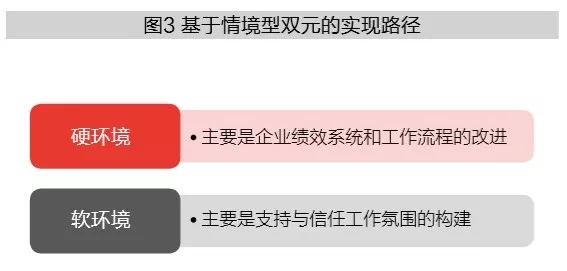其次,基于组织情境在整个组织内部设计同时体现内部业务单元活动的一致性和快速重构组织内部业务单元的适应性。基于组织情境的设计手段可以从两个层面进行构建:分别是硬环境和软环境(见图3),硬环境主要是企业绩效系统和工作流程的改进,例如:通过流程改进,引导并激励员工主动承担创新性任务,公平考核员工业绩,构建动态能力应对环境变换。组织软环境则是支持与信任工作氛围的构建,例如:建立完善的员工职业培养系统、增强员工之间的知识共享和互帮互助,实现在企业共同愿景下员工间的高效协同合作,实现企业可持续竞争力的创新。