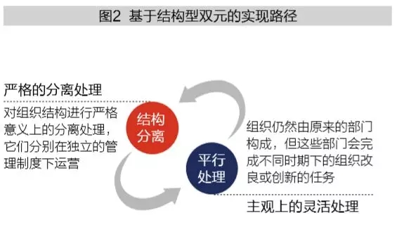 结构型双元,是指企业通过内部结构的分离,在不同部门有计划地开展互相独立的利用和探索性活动——即专门从事利用式创新的机械式结构和专门从事探索性创新的有机式结构,来应对环境变化。结构型双元其实质是将企业面临的矛盾性人物进行区分与整合,首先,这种结构上的任务区分保证了企业在针对矛盾性需求时能够保持多元化的竞争能力,降低了新旧要素间的冲突;其次,任务的整合又能够帮助企业将这些矛盾性的任务进行有机融合以保证其一致性。