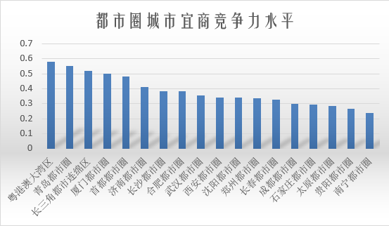 其中,粤港澳大湾区位居第一位,而长三角都市连绵区被青岛都市圈赶超,仅位列第三。究其原因,长三角都市连绵区尺度较广,包含22个城市(青岛都市圈包括5个城市),虽然其首位城市和次位城市上海、南京的宜商竞争力水平较高,但都市圈内部其他城市宜商竞争力较低,从而导致总体水平降低。