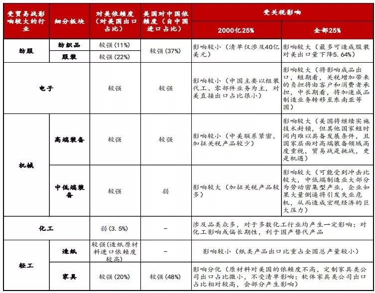 综上所述,我们认为贸易战短期内会对部分出口导向的行业,如计算机、电子、电气设备、纺织服装等,在盈利、就业等方面造成明显的冲击;产业转移将主要集中于出口商品中最终品带来国内增加值较高的行业,包括计算机、电子、光学制造,机电设备以及纺织服装和家具制造,但产业大面积转移短期来看由于技术、体量、成本因素制约,较难发生。