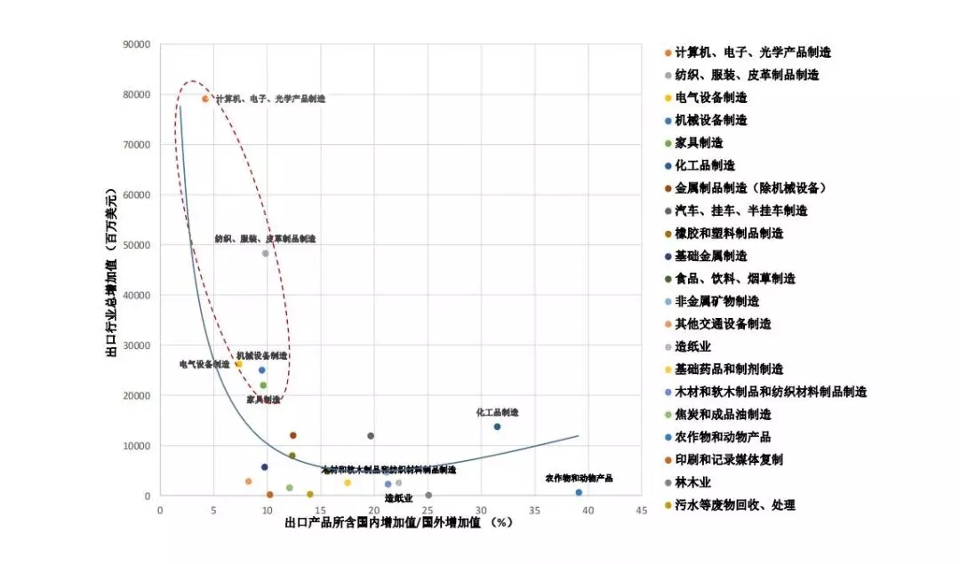 我们通过梳理增加值后发现,最终品出口国内增加值占比较高的行业中,加工贸易比重较高,而且劳动密集型行业也相对集中。由于中国近年来人力成本的提升,我们认为国内劳动参与度较高的行业发生产业转移的可能性更大。此外,我们还发现上述最终品出口带来国内增加值较大的行业,出口产品所包含的国内增加值与国外增加值比例较小,更加印证了该类行业向外转移较其他行业容易受到冲击。