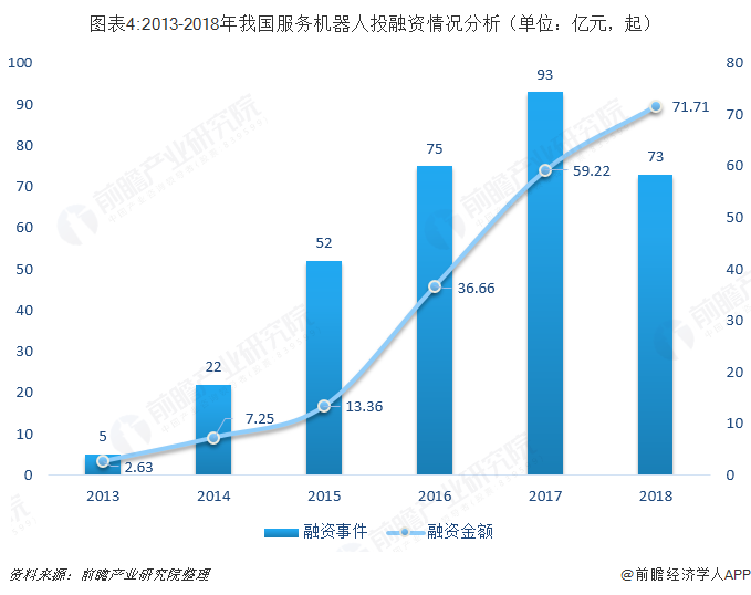 资本是产业发展的重要驱动力之一,近年来机器人行业都处于资本风口,服务机器人产业资本市场亦非常活跃。根据IT桔子统计,2018年我国服务机器人行业融资事件有73起,融资规模为71.71亿元。