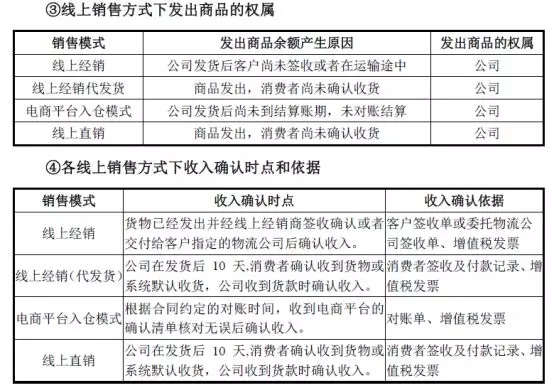 经销商发货模式:公司将产品销售给经销商再由经销商通过网店销售给最终消费者,最后由经销商将产品快递至消费者,该方式为线上经销的主要方式;经销代发货模式:以天猫商城为例,消费者在线上经销商的天猫商城网店下单后,公司通过富润系统获取订单信息,并根据该订单信息由公司直接发货给最终消费者。