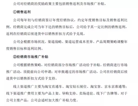 公司通过对经销商进行区域或者系统授权代理销售,区域授权主要以地级市为单位,目标为区域内商超、电器专营店、百货以及县乡镇分销渠道;系统授权为授权公司产品进入大型连锁超市,如大润发、沃尔玛、百佳超市等。基于小熊产品多年经营积累的口碑及品牌影响力,在上述渠道进行产品展示及销售,并定期举办活动,提供与客户互动场所,提高品牌曝光度。